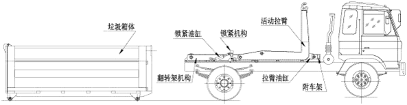 該車是由汽車底盤、拉臂主油缸、附車架、翻轉(zhuǎn)架、支撐腿(選裝)、鎖緊架、鎖緊油缸及多路換向閥等組成。翻轉(zhuǎn)架一端連在附車架上,其另一端設(shè)有活動拉臂,中間安裝有鎖緊系統(tǒng);活動臂油缸一端連在活動臂上,另一端連接在附車架上;鎖緊機構(gòu)通過鎖緊油缸的動作可以在箱體自卸時將附車架上的箱體與翻轉(zhuǎn)架及拉臂連為一體,在主油缸伸出時形成自卸角,也可以通過鎖緊油缸的收回把翻轉(zhuǎn)架與附車架鎖緊為一體,利用主油缸的收回或伸出使活動拉臂將地下的垃圾箱拖拉至附車架上或從附車架上放回到地面。